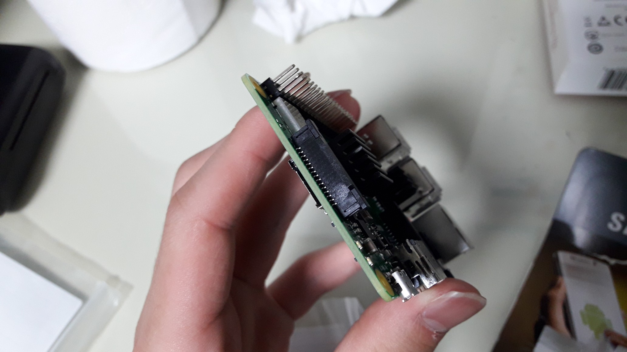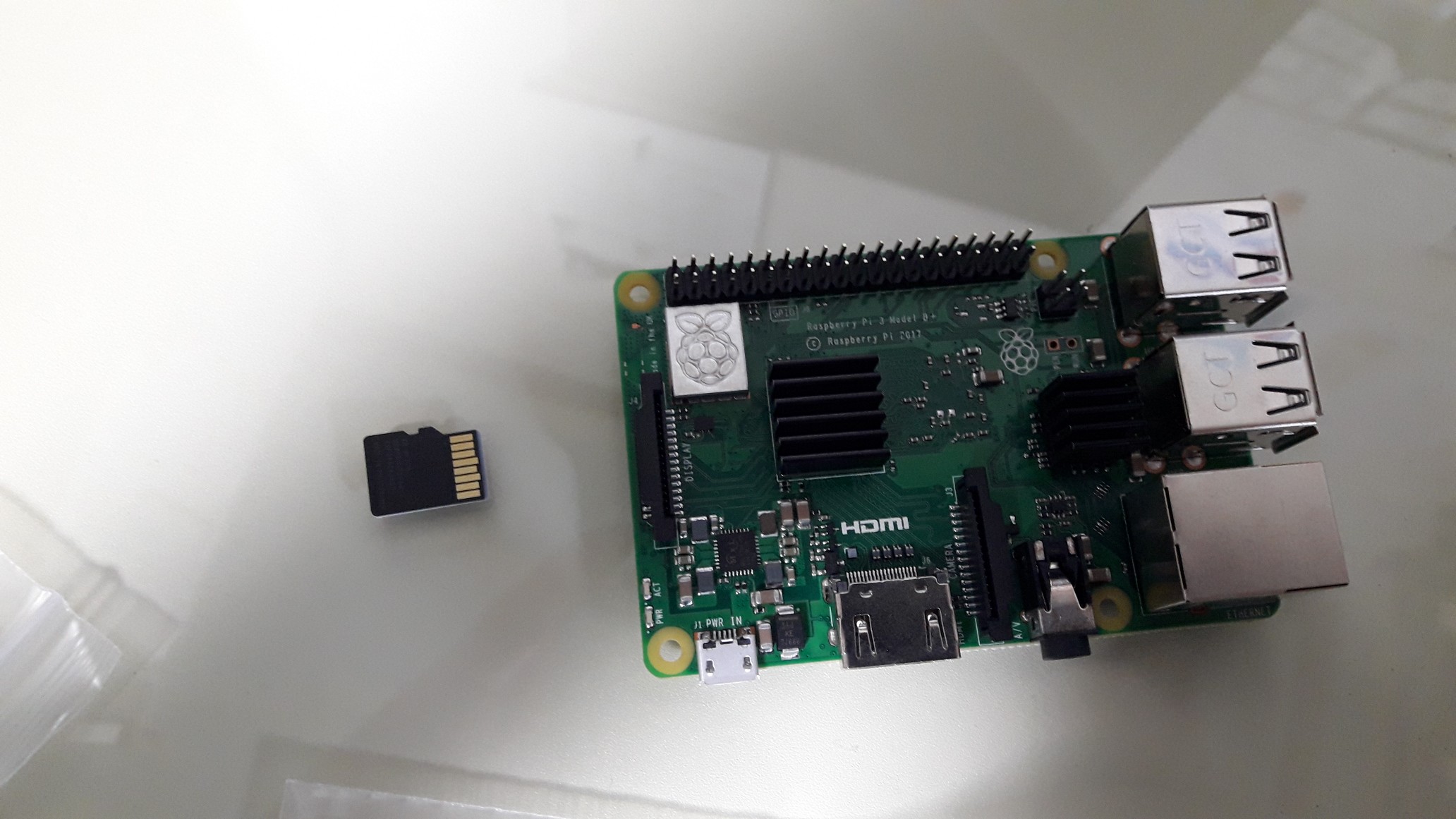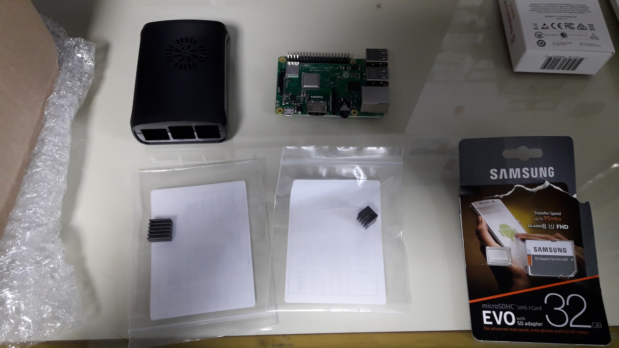 *. 왼쪽부터 케이스, 라즈베리파이 본체, SD 카드입니다. 케이스는 장착을 실패했습니다. 다른 것을 하나 더 구매해 보아야겠습니다.