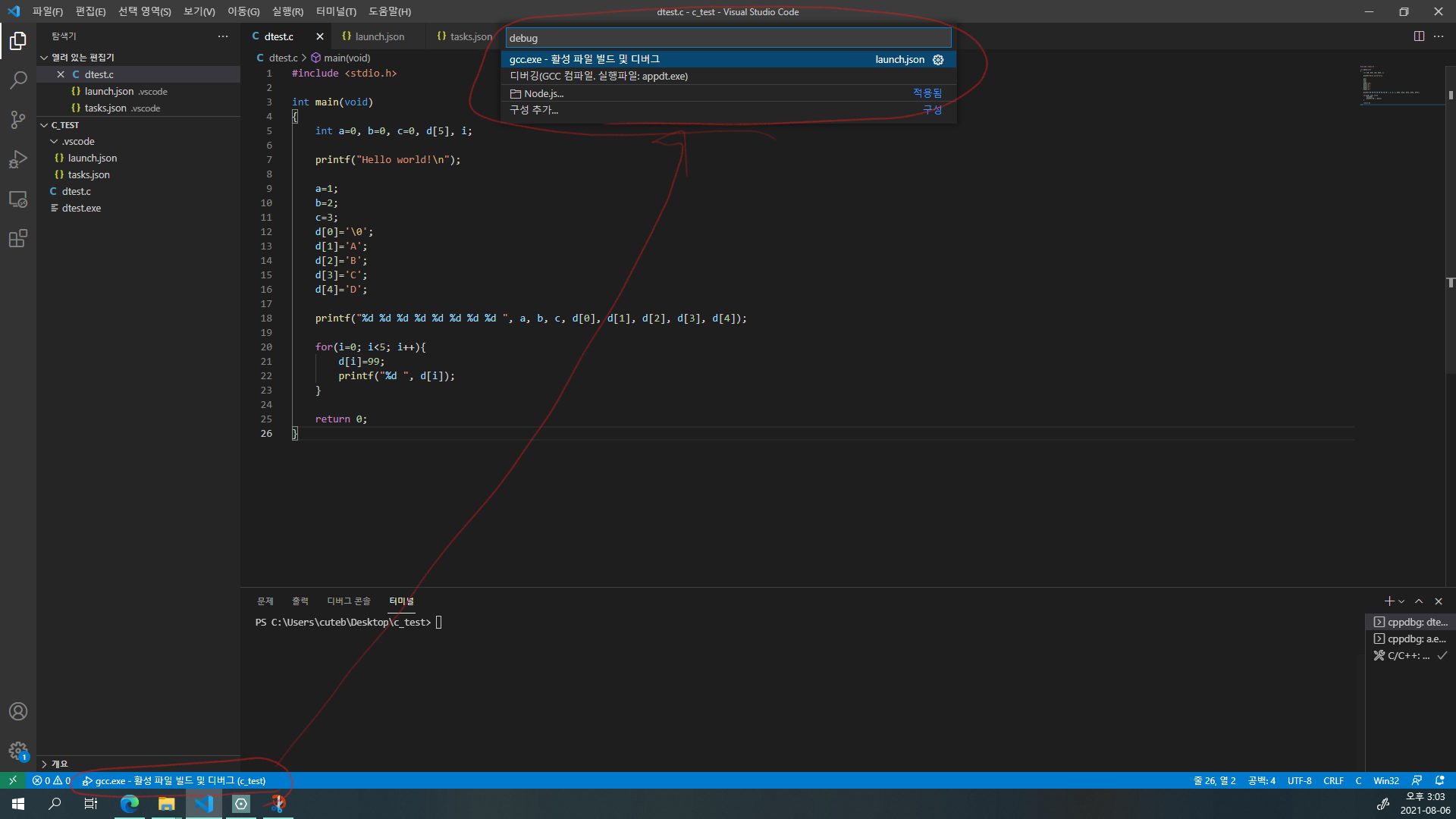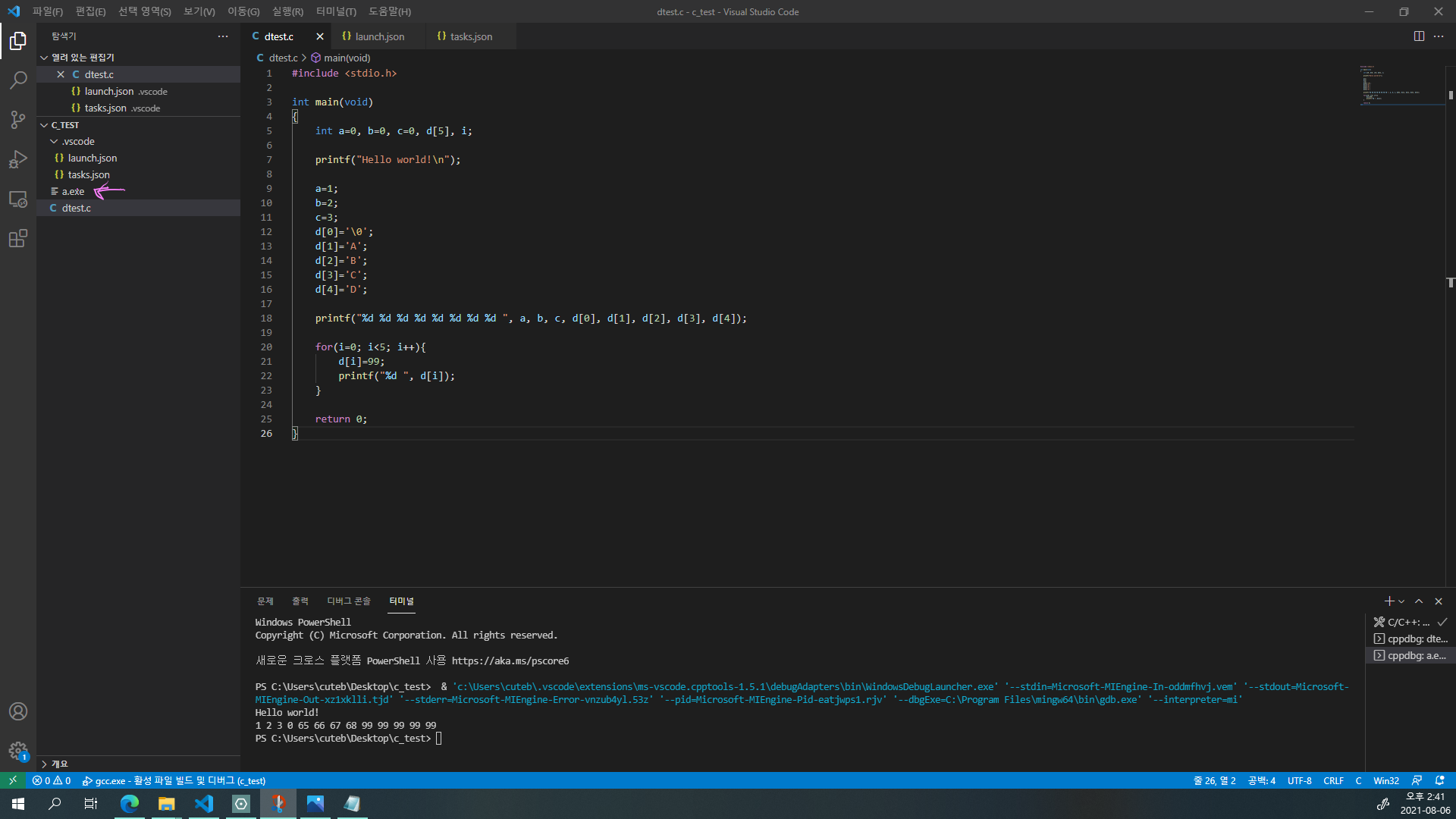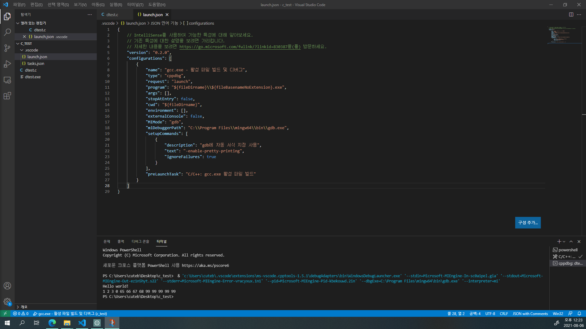 4. 그러면 C code가 빌드되어 터미널에서 실행될 것이고, 화면에 launch.json이 띄워질 것이며,