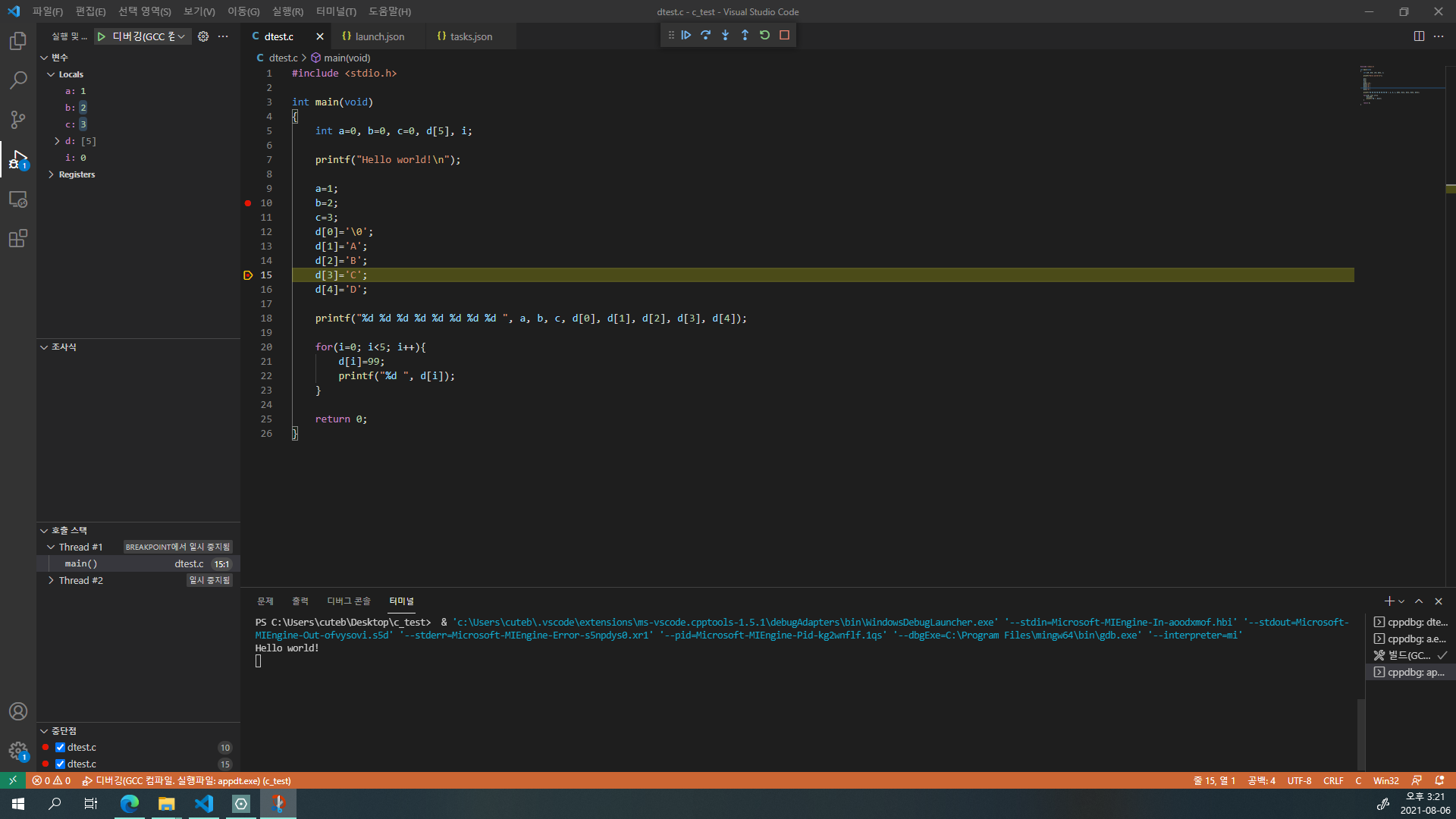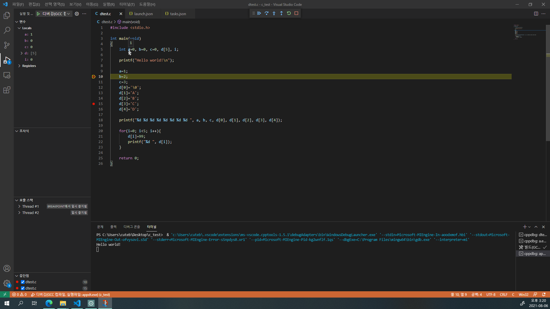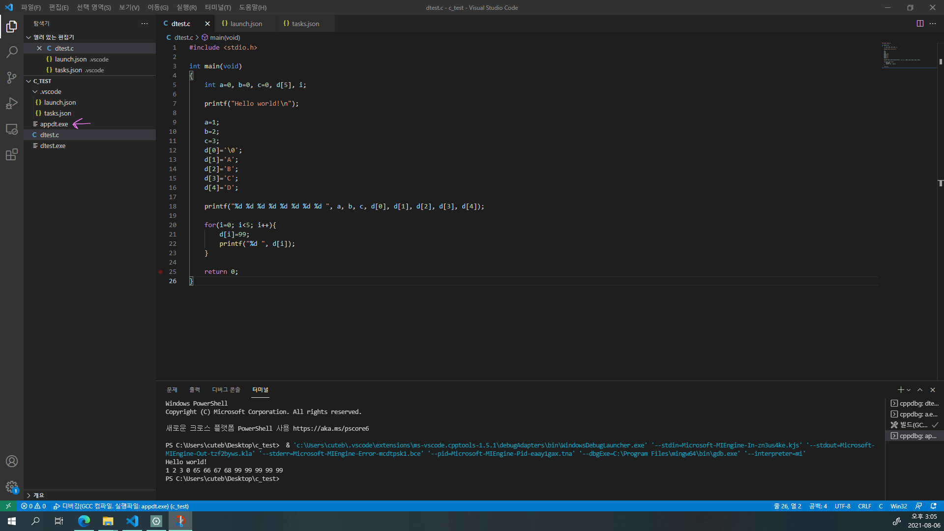4. 그러면 C code가 빌드되어 터미널에서 실행될 것이고, 화면에 launch.json이 띄워질 것이며,