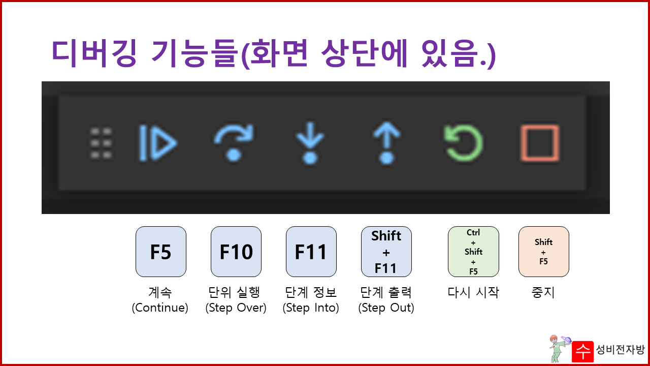 화면 상단을 보시면 디버깅에 쓸 수 있는 기능들이 있는데요,