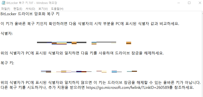 파일에 저장하면 TXT 파일로 저장됩니다. 백업해 둔 복구 키는 잘 보관하시다가 나중에 복구 키를 입력하라고 뜨면 입력하시면 됩니다.