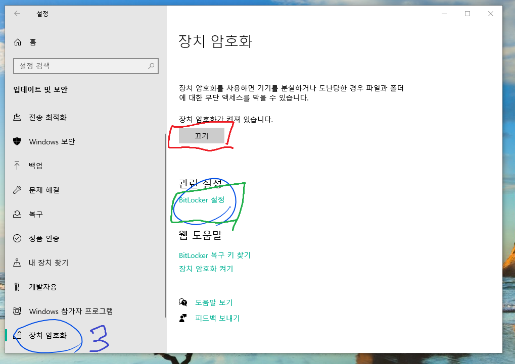 BitLocker는 설정→업데이트 및 보안→장치 암호화에서 켜고 끌 수 있는데요.