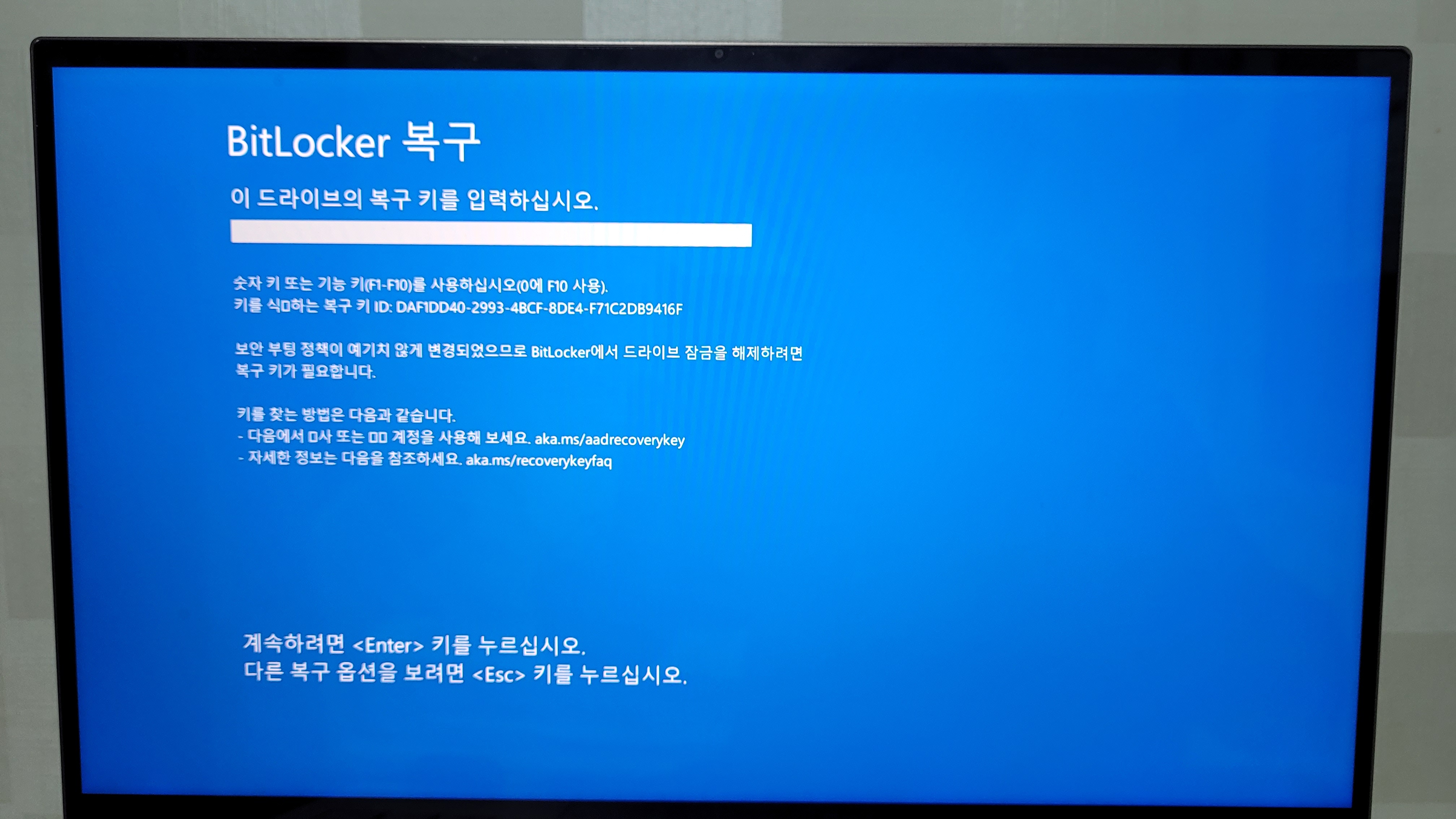 복구 키를 입력하면 부팅이 가능하겠죠? 위 사진은 2021년 1월에 찍은 사진입니다. 이때는 제가 복구 키를 백업하지 않아서 복구를 못했어요. 복구를 하려면 사전에 복구 키를 미리 백업하셔야 해요!