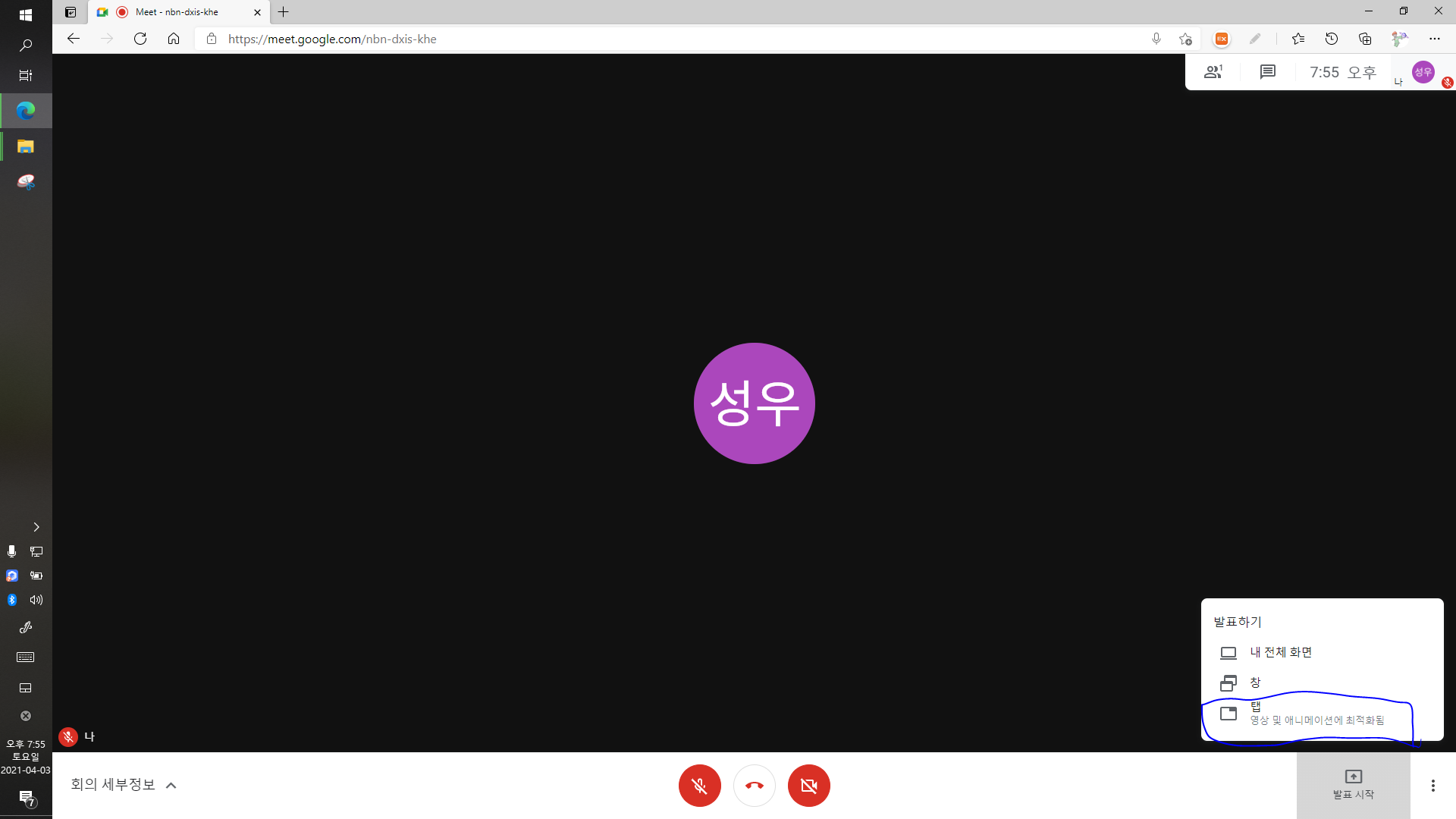 Google Meet(관련글) 우측 하단 발표 시작을 클릭하고, 탭을 선택하시면