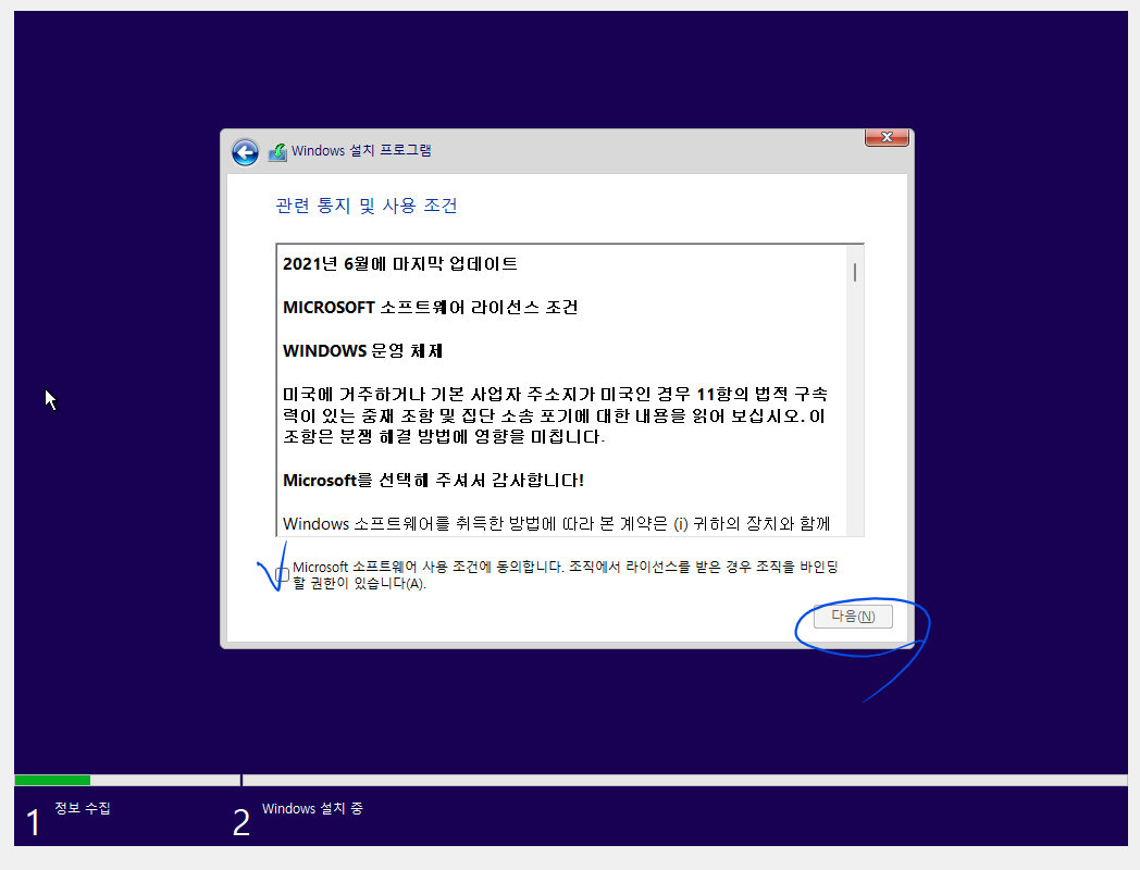 그리고 이제 설치 과정은 Windows 10과 비슷하므로 간략하게만 설명 드리겠습니다.