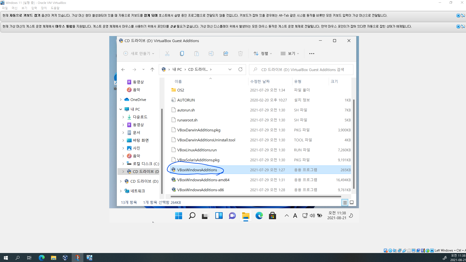 3. 게스트 확장 CD에 있는 VBoxWindowsAddtions를 실행합니다.