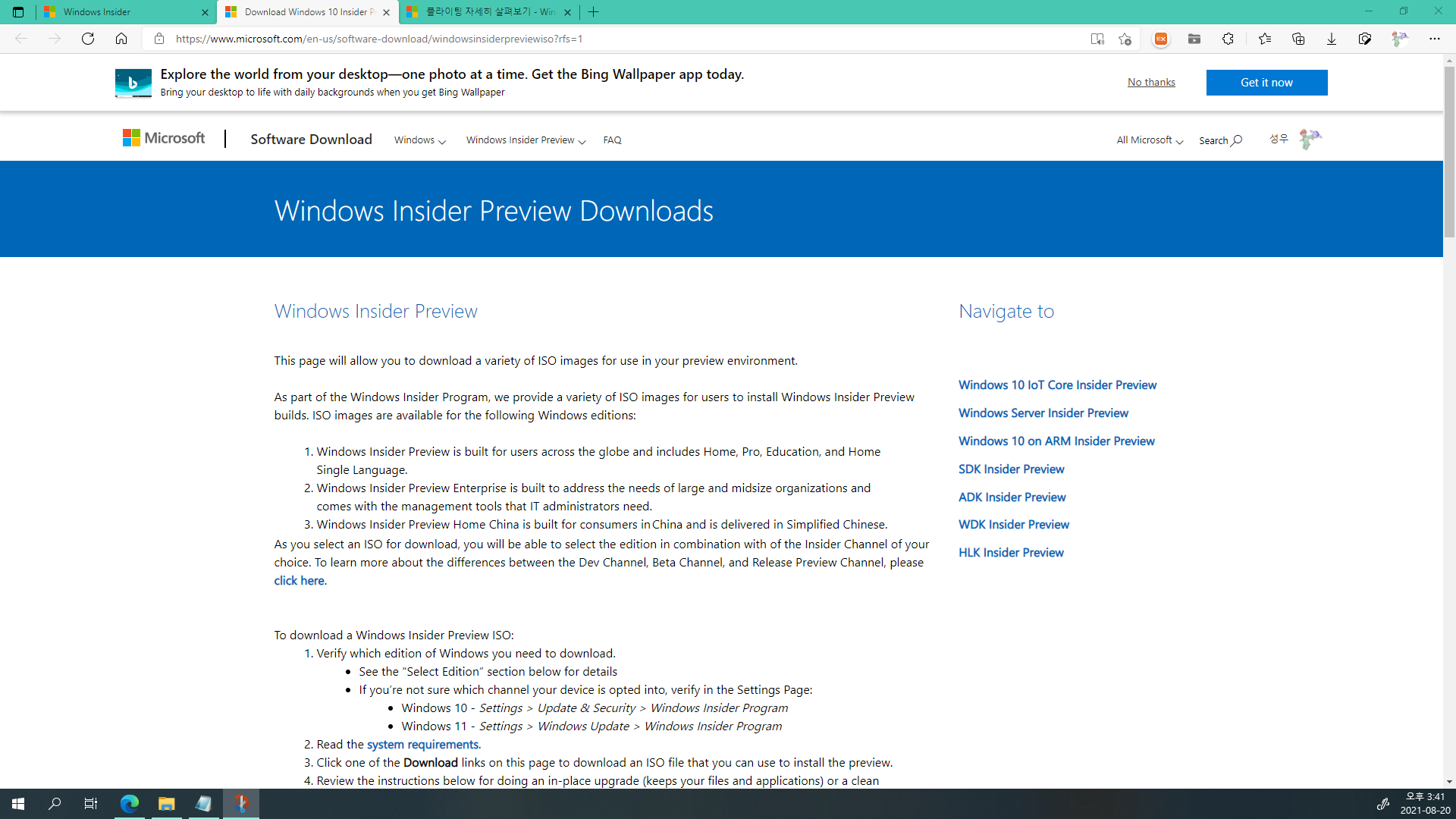 8. download a Windows Insider Preview ISO를 클릭하세요.