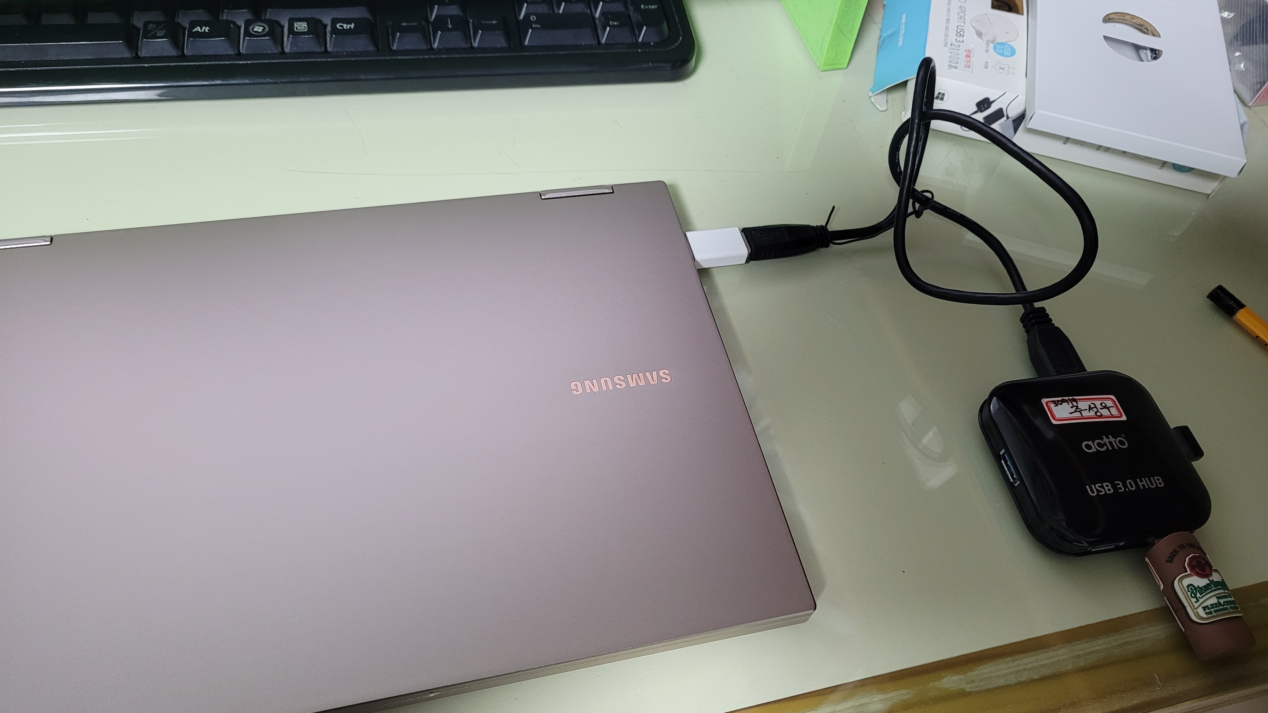 Windows 설치파일이 있는 USB도 꽂아야 하고, 마우스도 꽂아야 하는데 USB C to A 어댑터를 하나밖에 제공받지 못하였으니 개인적으로 갖고 있는 허브를 사용합시다.