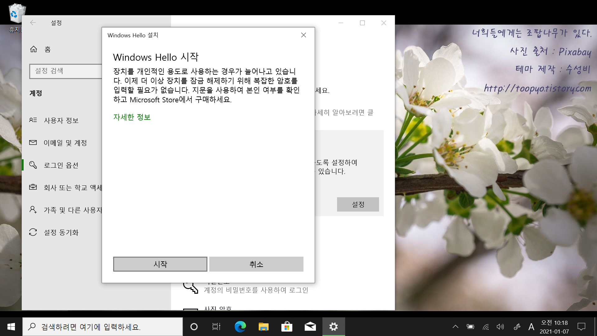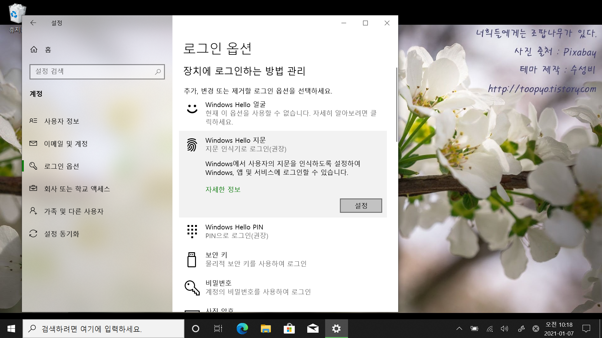 3. 좌측 목록에서 로그인 옵션으로 들어간 뒤 우측에서 Windows Hello 지문을 선택합니다. 그 다음 설정 클릭.