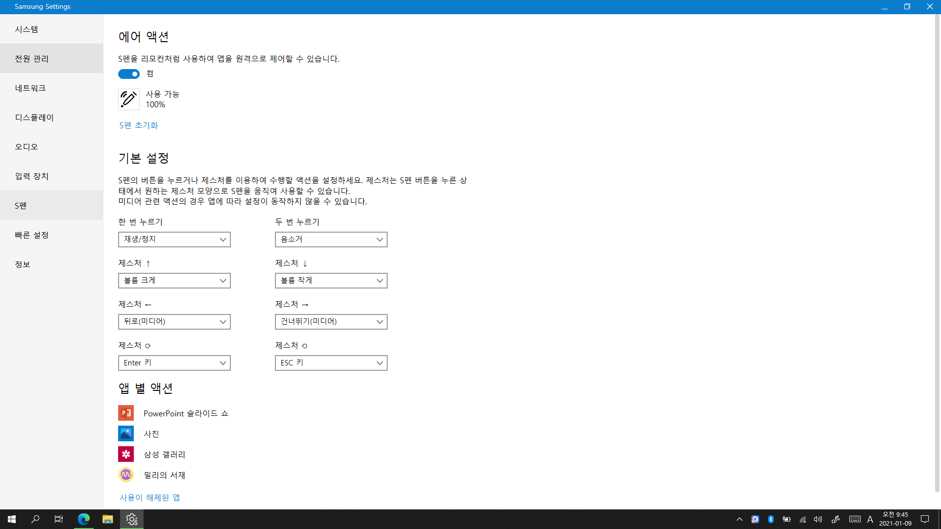 갤럭시 북 Flex2의 S펜도 요즘 출시되는 갤럭시 노트 시리즈의 S펜처럼 블루투스 기능이 있어서 버튼을 누르거나 제스처를 취하여 액션을 수행하게 할 수 있습니다. Samsung Settings에서 설정을 바꾸실 수 있습니다. PPT 발표할 때 프리젠터 용도로 잘 쓰일 것 같네요.