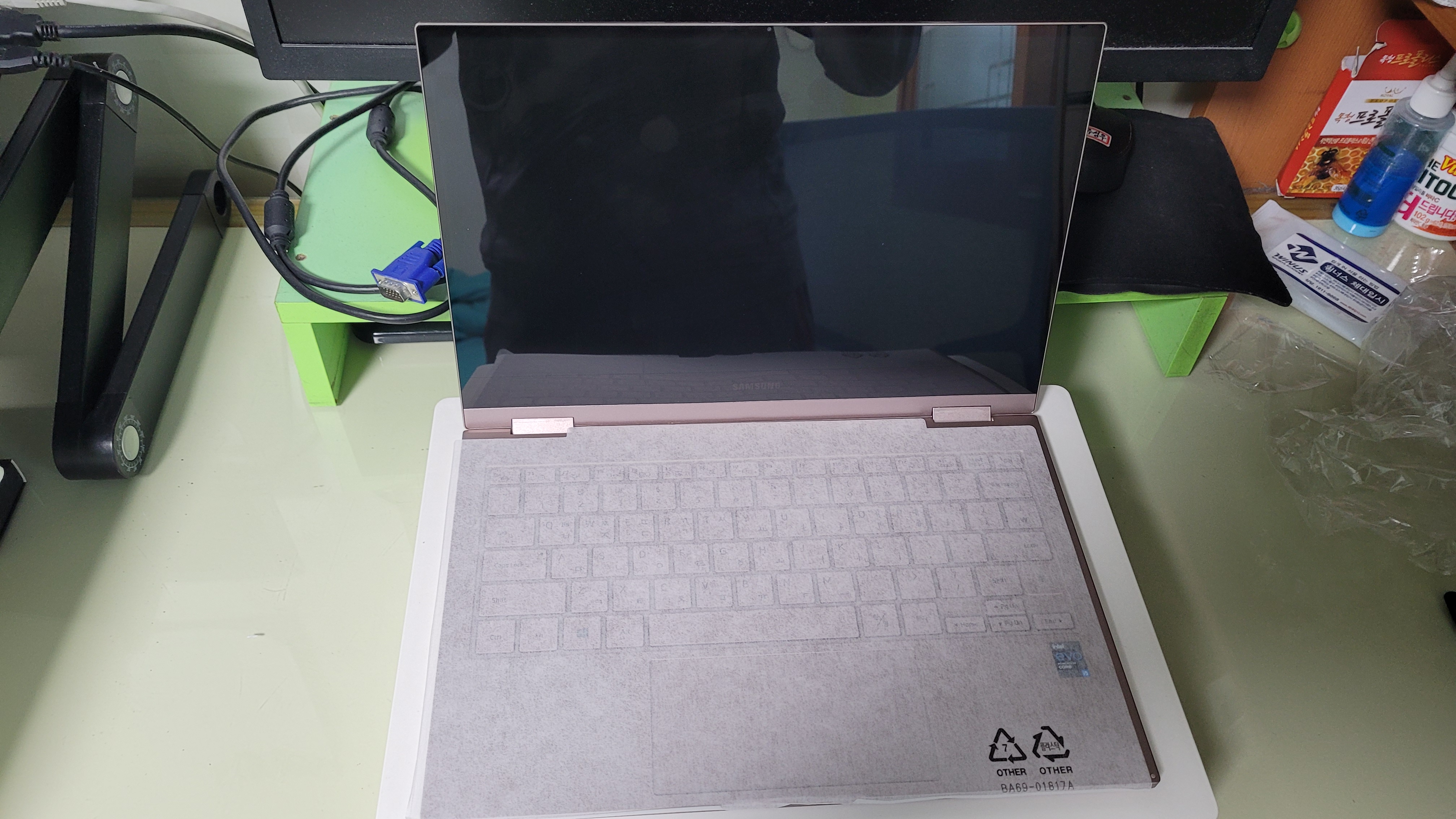 덮개를 엽니다. 하얀 무언가가 또 보이네요. 노트북 뜯으면서 하얀 비닐같은 게 있는데 비닐이 아니라 플라스틱입니다. 사진 잘 보시면 그렇게 써 있죠?