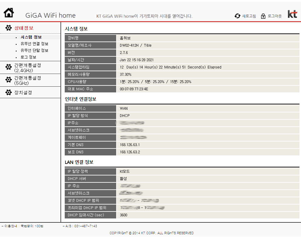 3. 웹브라우저에서 게이트웨이 주소로 접속합니다. 그러면 공유기 설정 페이지가 나옵니다.