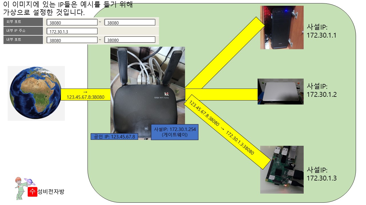 수성비전자방입니다. 오늘은 제가 사용하는 KT 공유기에서 포트포워딩하는 방법을 알려드리겠습니다. 포트포워딩을 하려고 하시는 분들은 외부 네트워크에서 기기에 연결하기 위함이겠죠?