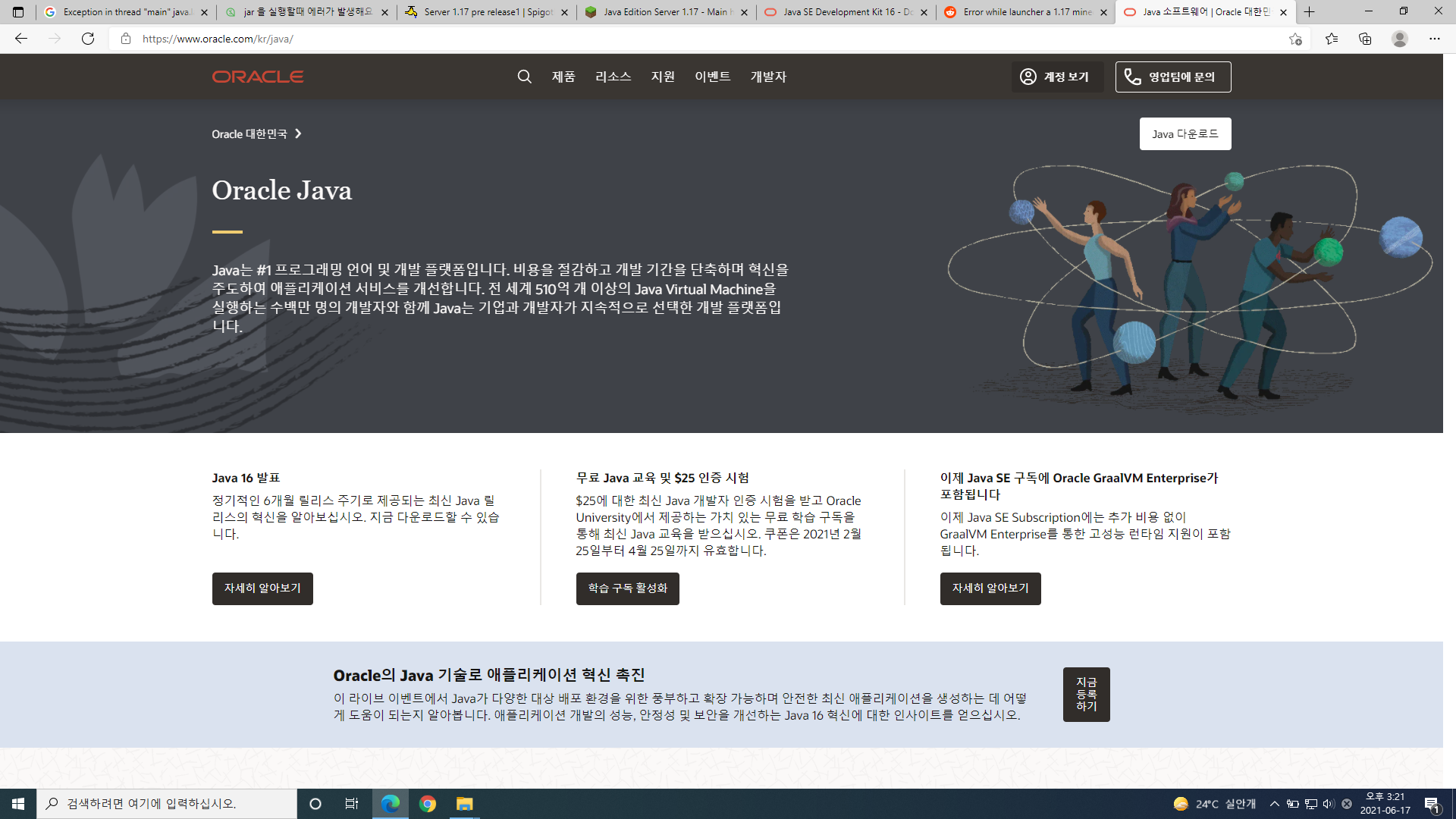 마인크래프트 1.17 서버를 돌리기 위해서는 Java 16 (이상)이 필요합니다.(아래 내용 참고)