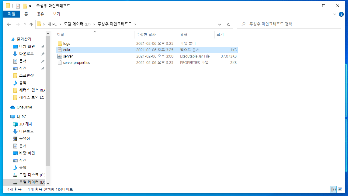 서버로 사용할 PC가 제 PC가 아니다 보니 확장명 관련 설정을 바꾸지 못했습니다. 스크린샷에 확장명이 안 보이더라도 양해 부탁드립니다.