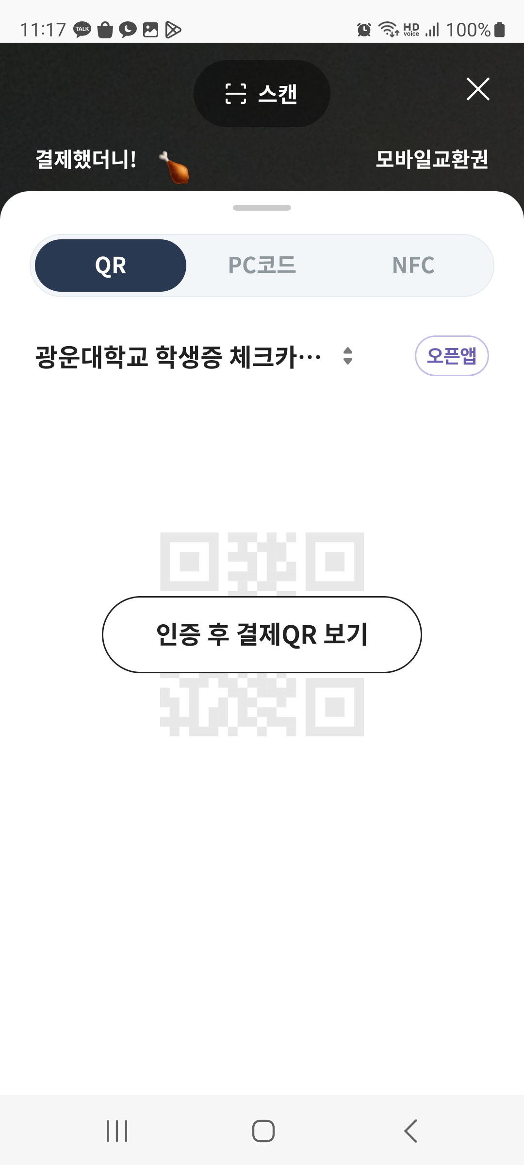 이제 결제 방법을 알아보겠습니다. 페이북에서 앱카드 상호연동 서비스를 이용할 경우 QR코드 또는 NFC(JUSTOUCH)로 결제하실 수 있습니다.(PC코드는 불가능)