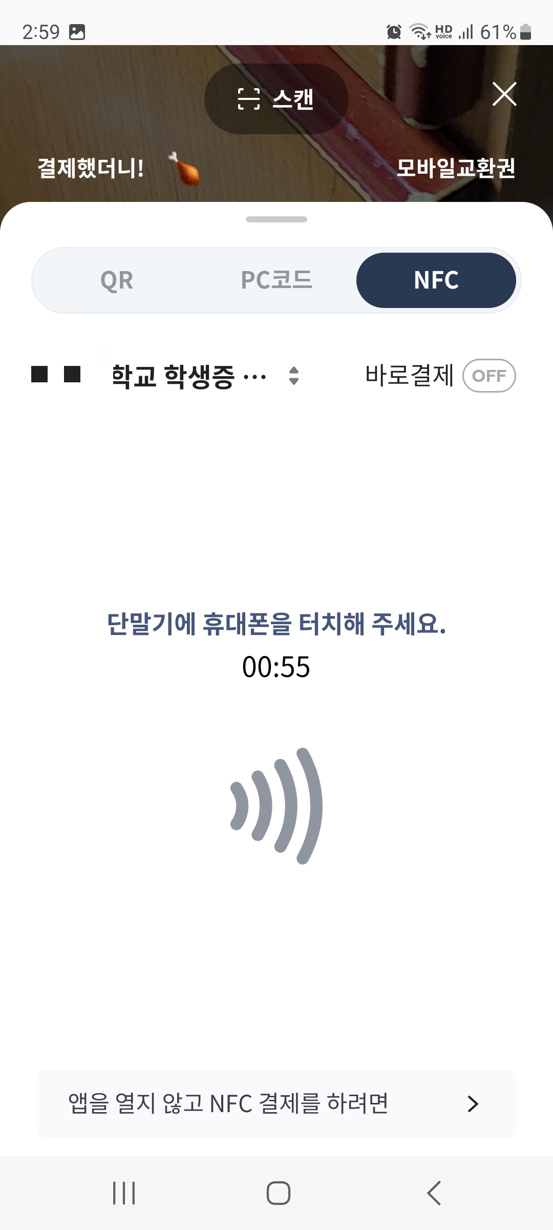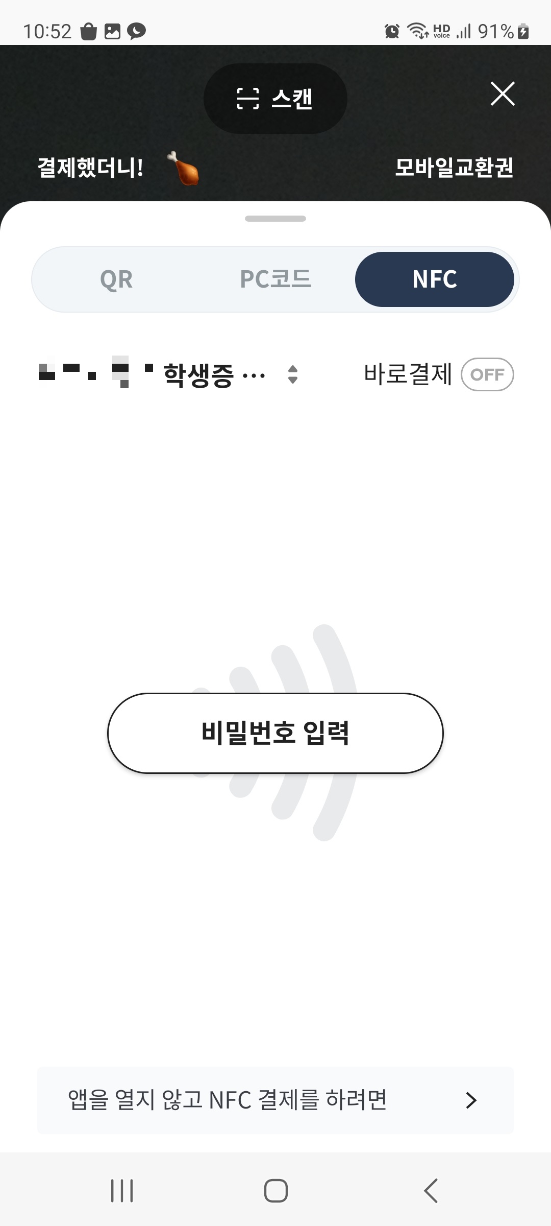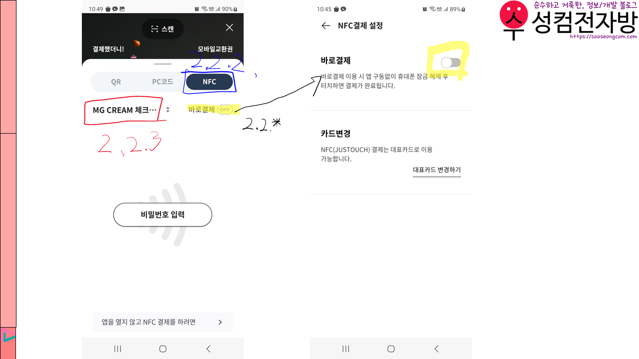 2.2.*. 바로결제가 켜져 있으면 대표카드 외에 다른 카드로 NFC 결제를 할 수 없습니다. 그리고 앱카드 상호연동 서비스로 추가한 카드는 바로결제가 불가능합니다. 따라서 바로결제를 꺼야 합니다.