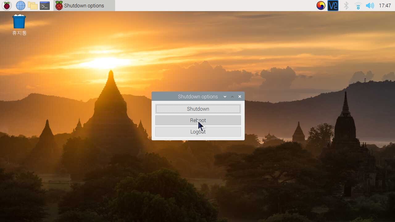 11. 좌측 상단의 메뉴 아이콘을 클릭하고, 로그아웃을 클릭한 다음, Shutdown options에서 Reboot하시면 고정IP가 적용된 것을 확인하실 수 있습니다.