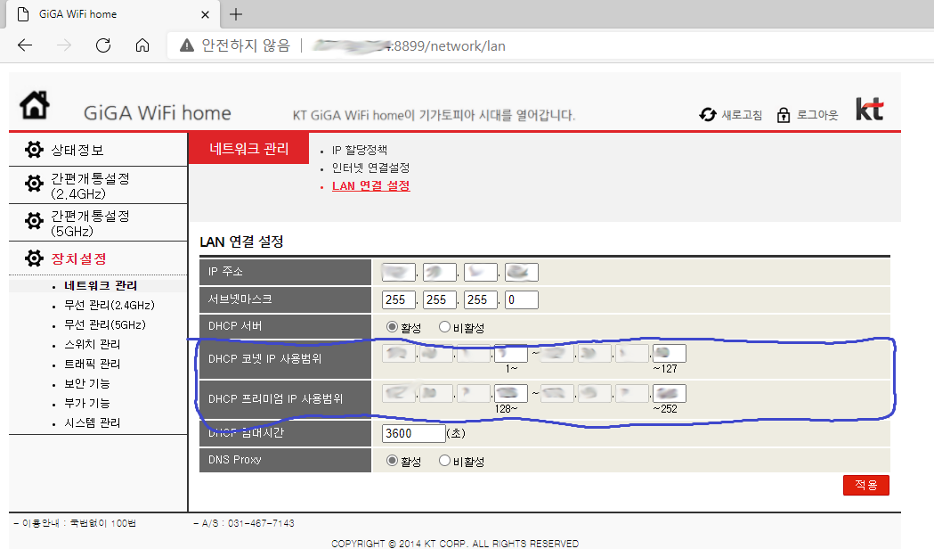 4. 웹브라우저에서 게이트웨이로 접속하시면 공유기 설정 페이지로 연결됩니다. DHCP IP(사설IP) 사용범위를 확인하시기 바랍니다.(KT 공유기의 경우 장치설정→네트워크 관리→LAN 연결 설정 에서 확인하실 수 있습니다.) 그리고 현재 사용중인 사설IP 외의 다른 IP를 라즈베리파이의 고정IP로 설정하겠습니다.