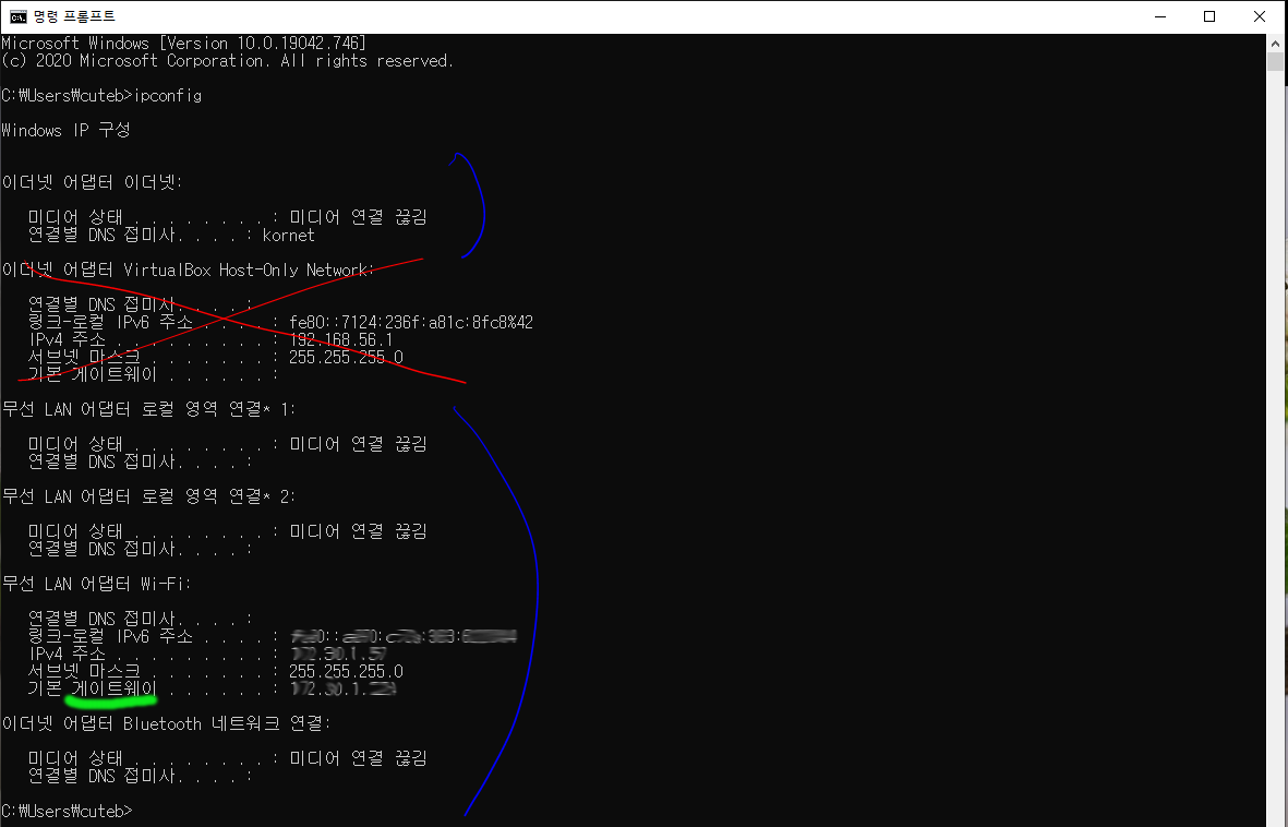3. 유선랜을 연결하신 분은 이더넷 어댑터 이더넷을, 무선랜을 연결하신 분은 무선 LAN 어댑터 Wi-Fi를 주목하시기 바랍니다. 연결별 DNS 접미사, IPv6 주소, IPv4 주소, 서브넷 마스크, 기본 게이트웨이가 나올 것입니다. 여기서 게이트웨이 주소를 확인합니다.