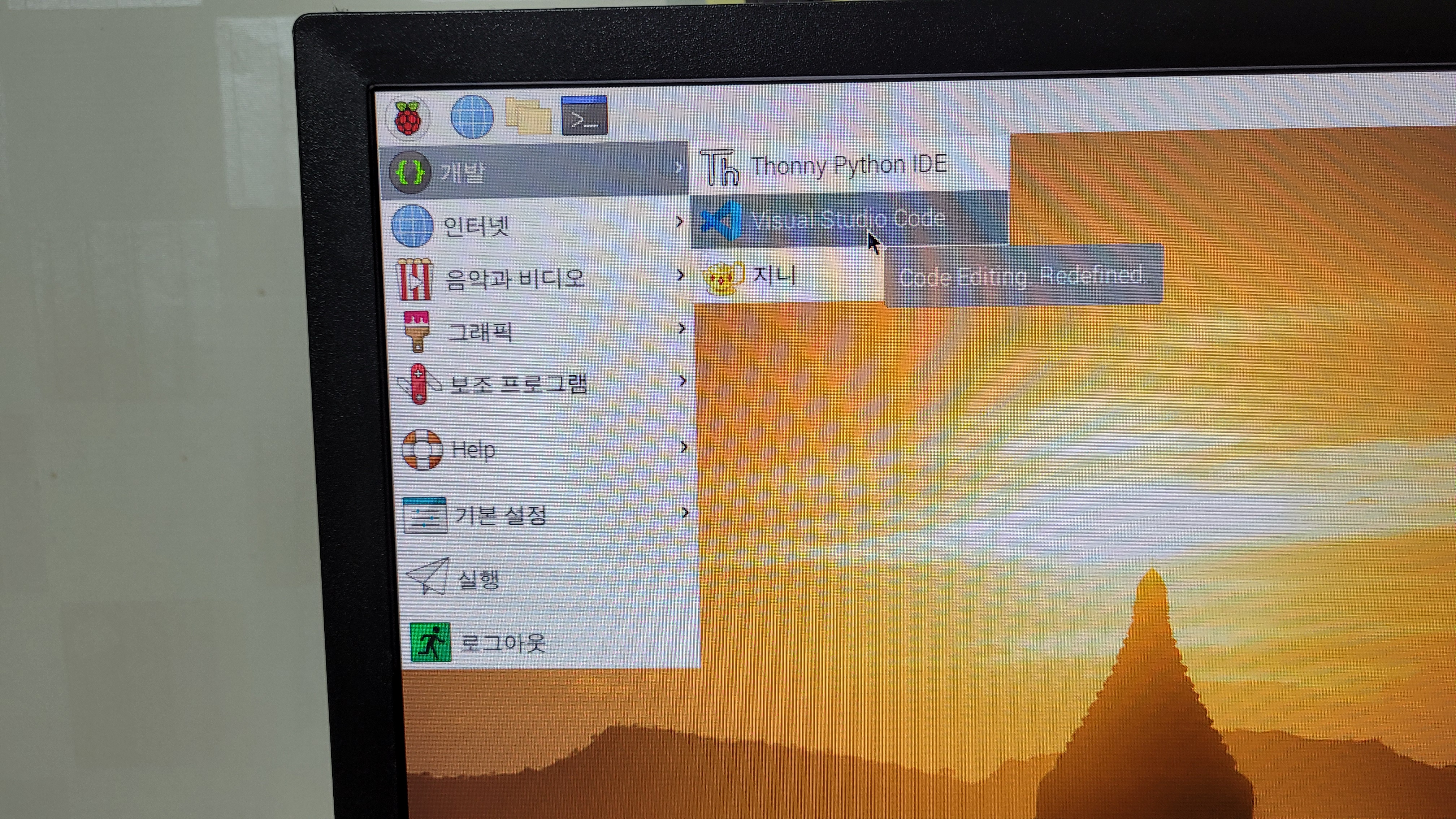 5. 라즈베리파이 메뉴→개발 로 들어가시면 Visual Studio Code가 설치되어 있는 것을 확인하실 수 있습니다.
