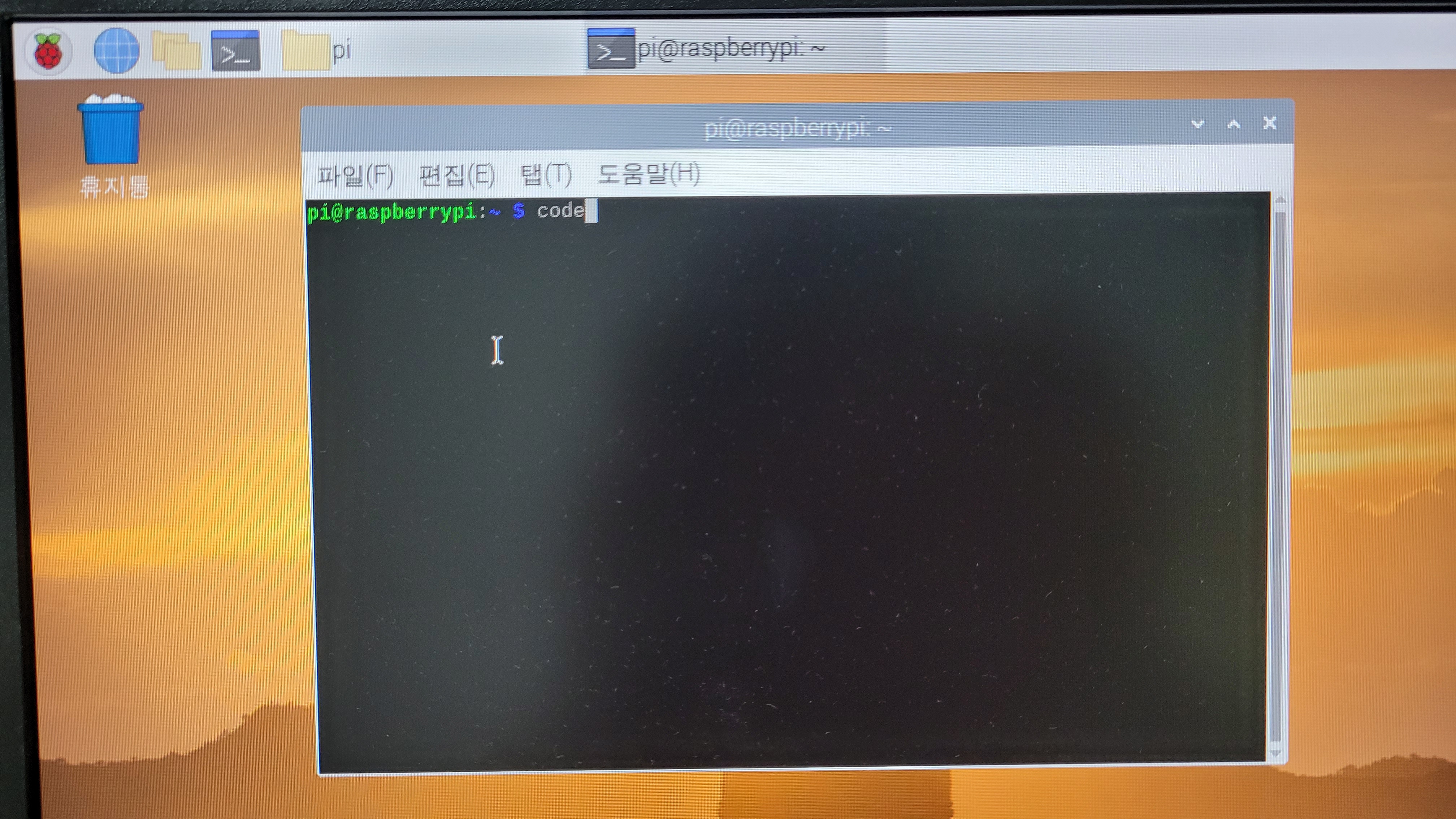 1. 라즈베리파이 OS를 부팅하고, 터미널을 실행합니다.