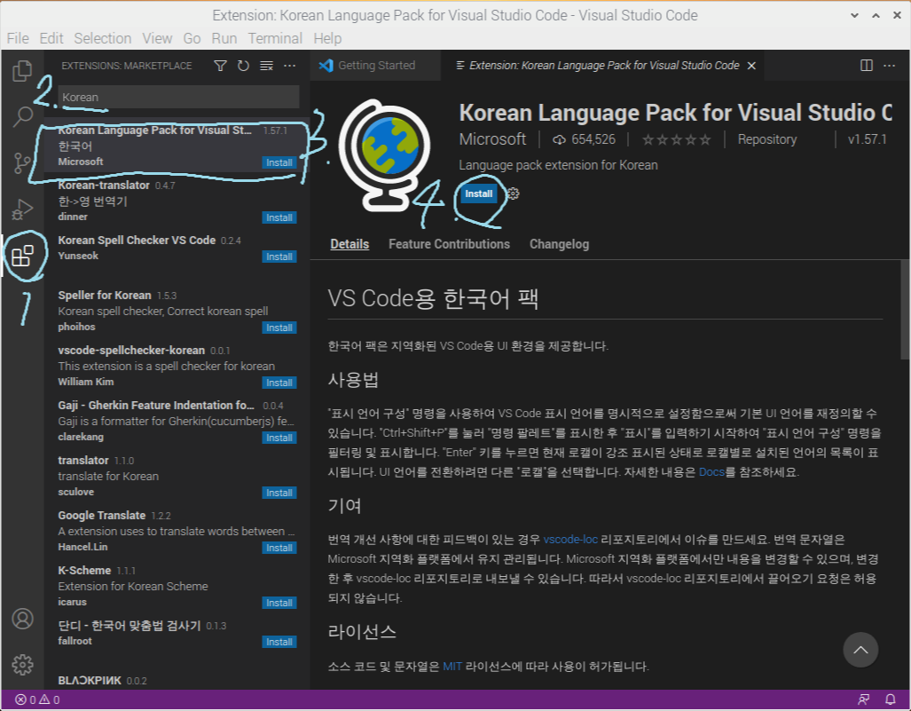 3. Korean Language Pack for Visual Studio Code를 클릭합니다.