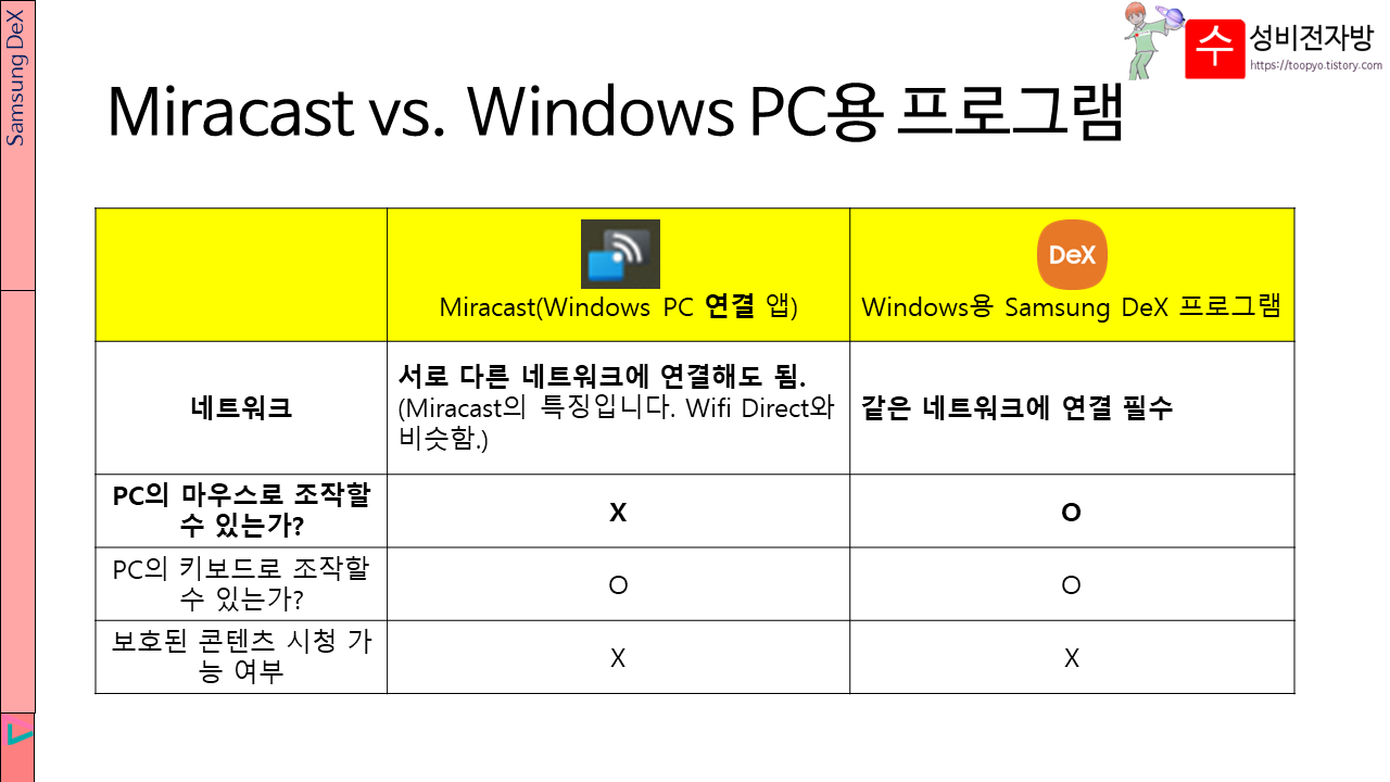 사실 Samsung DeX를 PC와 무선 연결하려면 PC용 Samsung DeX 프로그램을 쓰면 되는데요, 차이점이 있습니다. 연결 앱을 이용한 Samsung DeX를 Windows PC용 Samsung DeX와 비교해 보겠습니다.