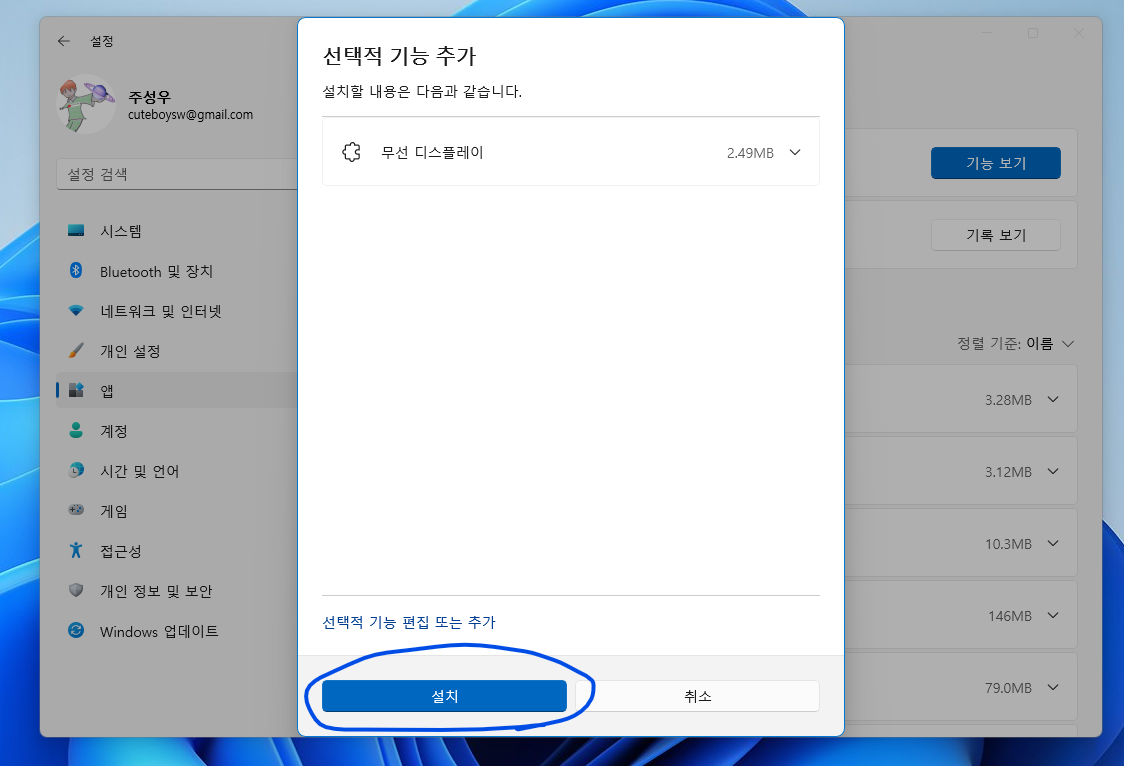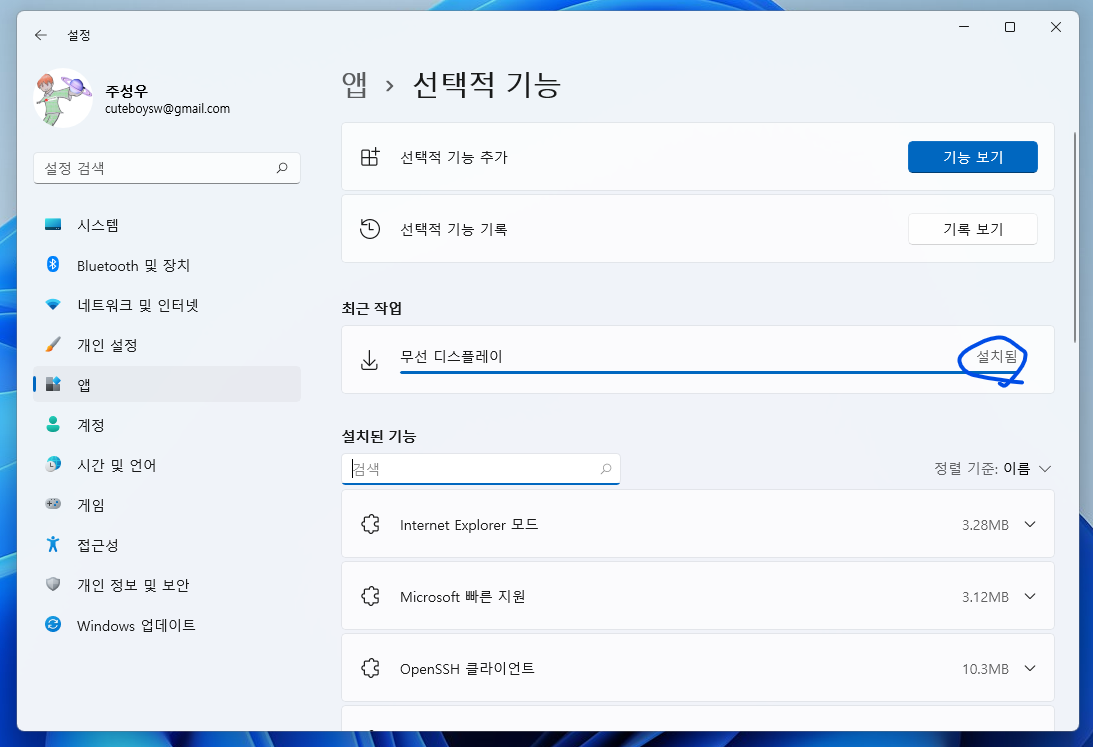 1. 선택적 기능에서 '무선 디스플레이' 추가