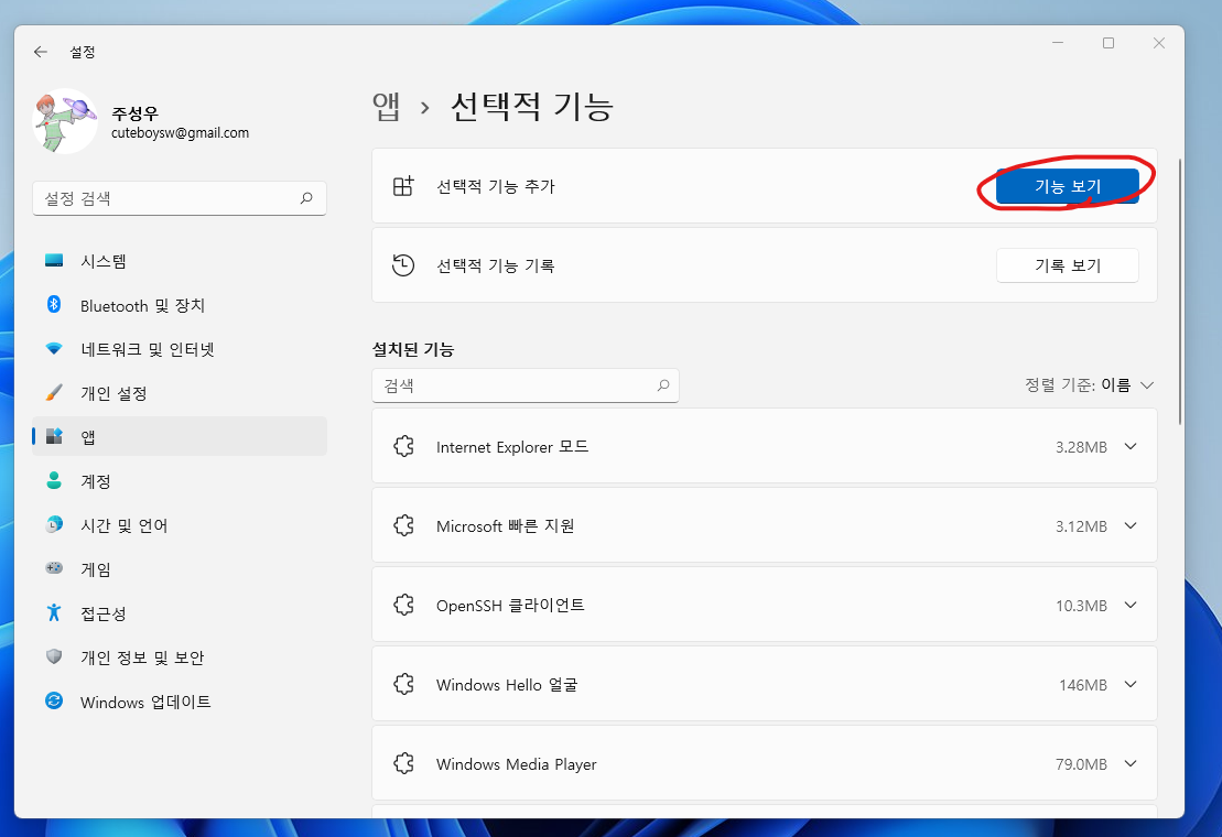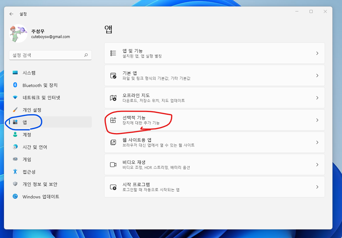 Windows PC를 Miracast 출력 기기로 사용하기 위해서는 선택적 기능 중 '무선 디스플레이'가 활성화 되어 있어야 합니다. 지금부터 그 기능을 활성화 해보겠습니다.